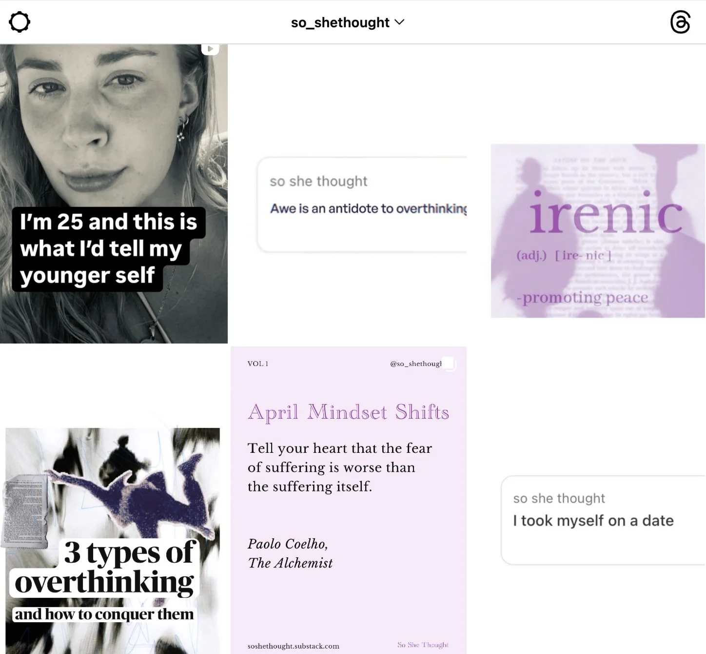 My weekly articles blend personal reflection with psychological research and cultural critique, touching on themes like overthinking, culture, navigating adulthood, creativity and emotional wellness. Each article invites readers to think more deeply and find clarity and connection amid the chaos of contemporary life. I create thoughtful Instagram copy to promote each post, offering visual storytelling that extends the conversation across platforms.
