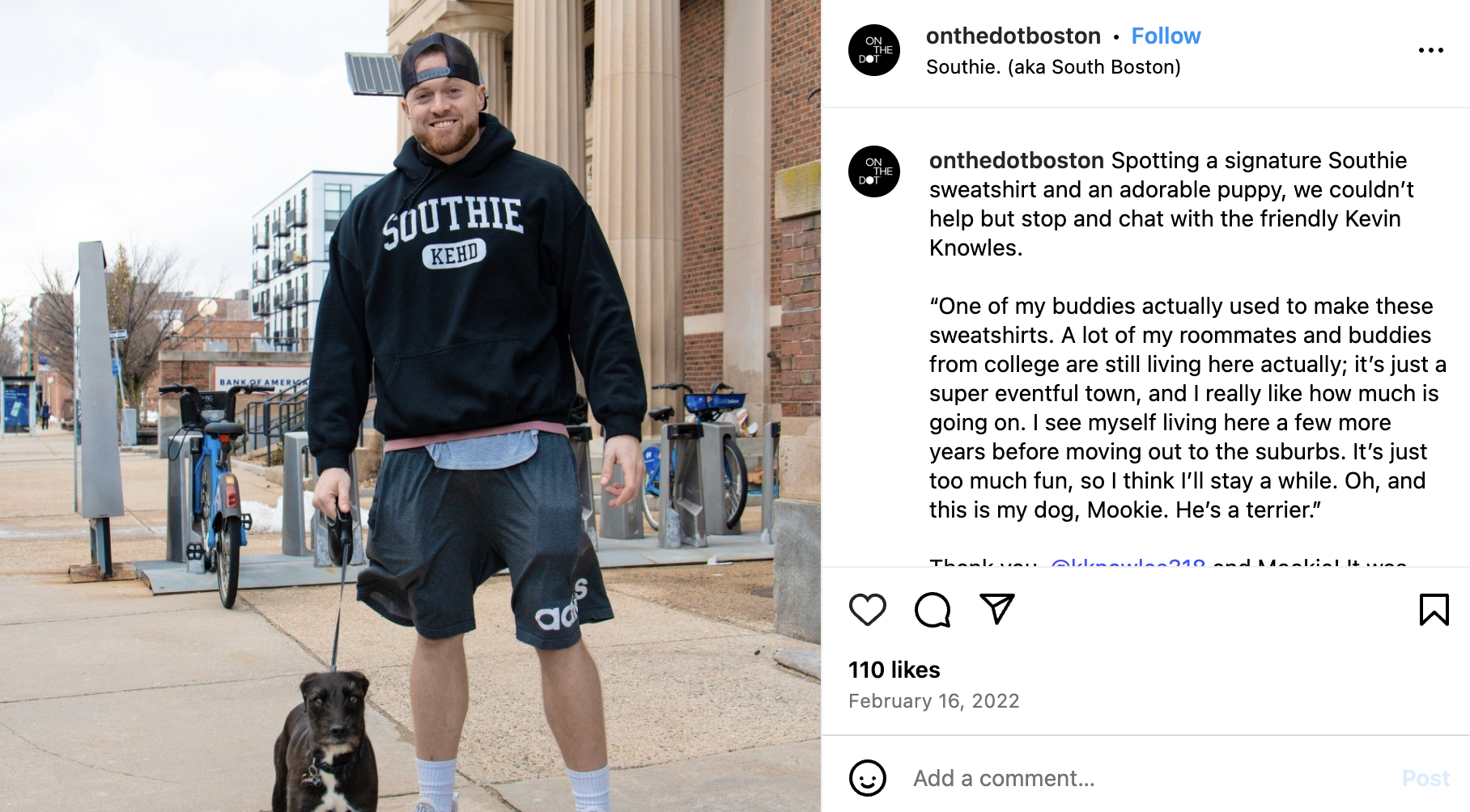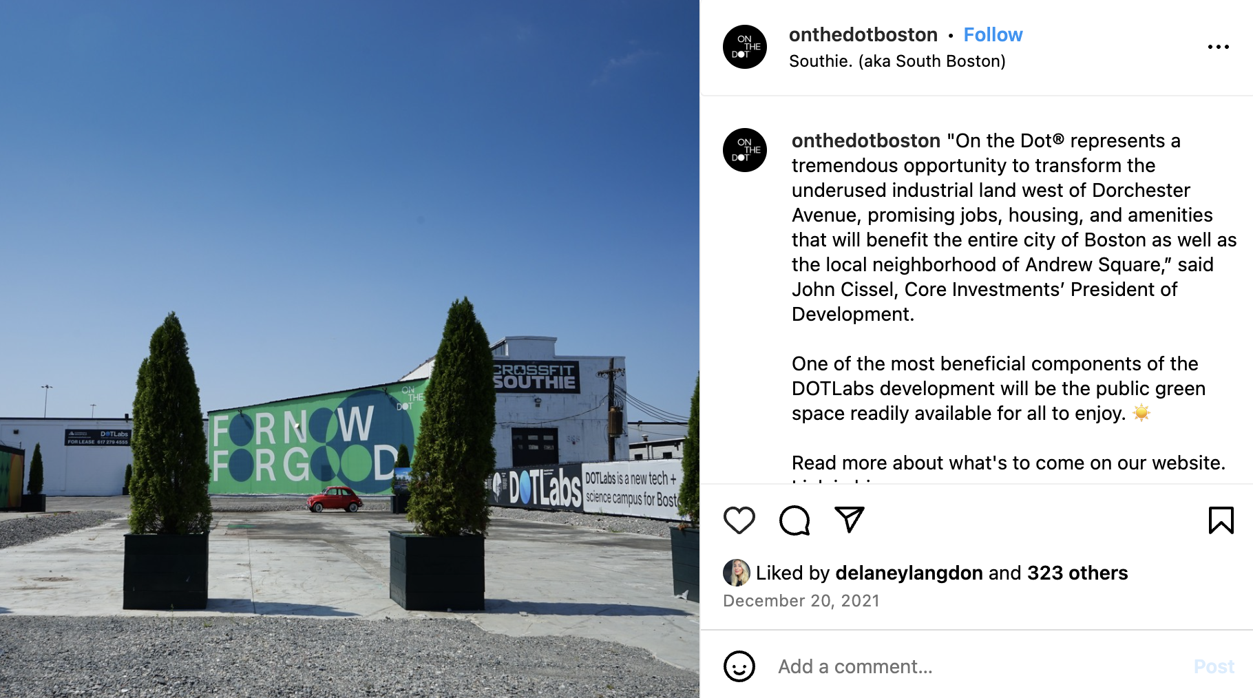 I conducted video and photo interviews with South Boston business owners and residents, before crafting engaging social media copy and edited the footage into dynamic Instagram Reels. Each piece of content was designed to amplify local voices and reinforce On the Dot’s brand identity as a “Place with Purpose.”